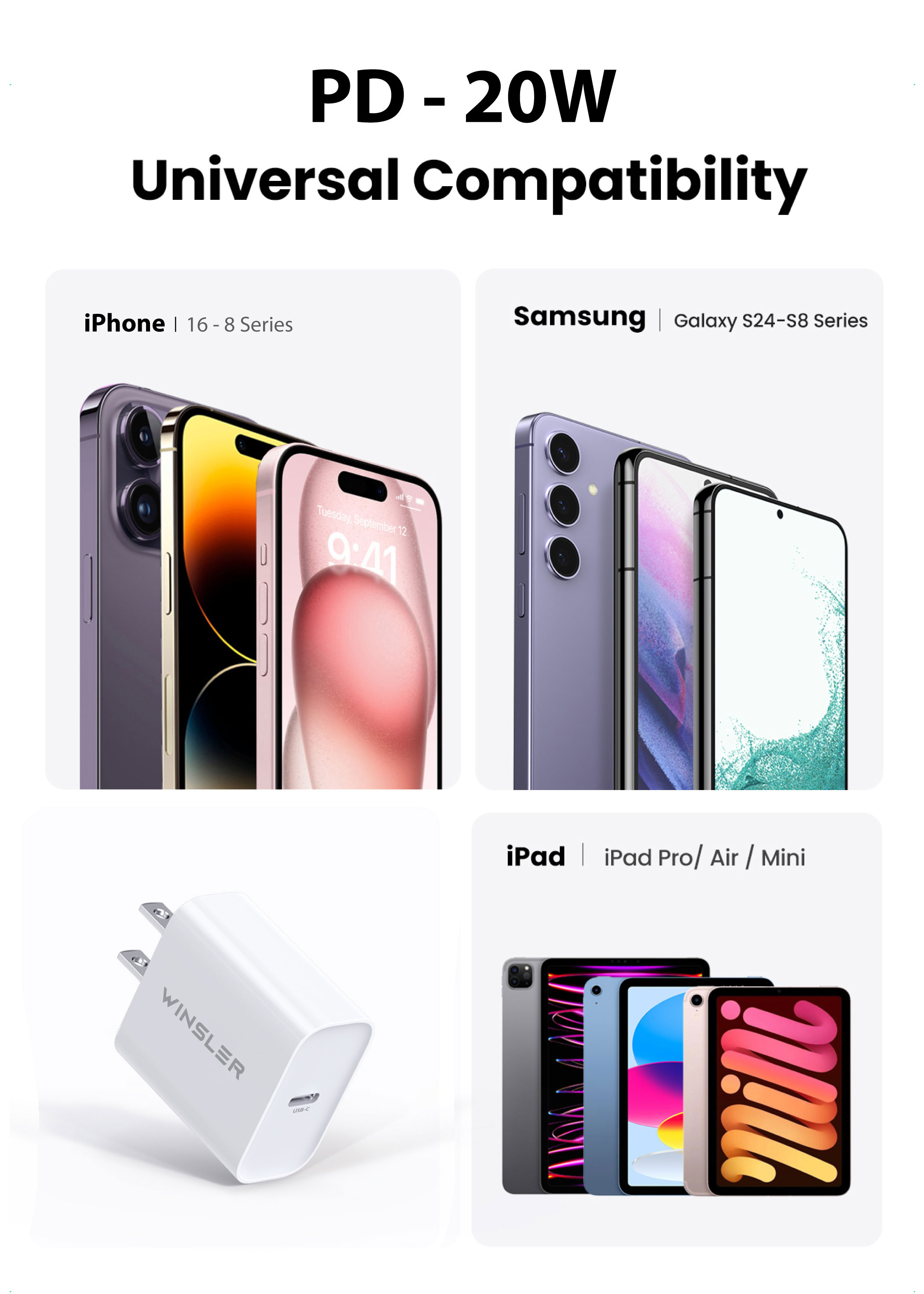 WINSLER 20W PD Fast Charger – 1-Port USB-C Adapter (2-Pack)