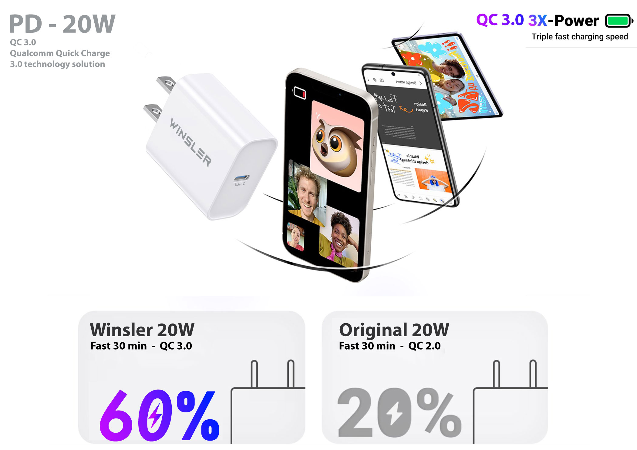 WINSLER 20W PD Fast Charger 1C1A – Dual Port Adapter (2-Pack)